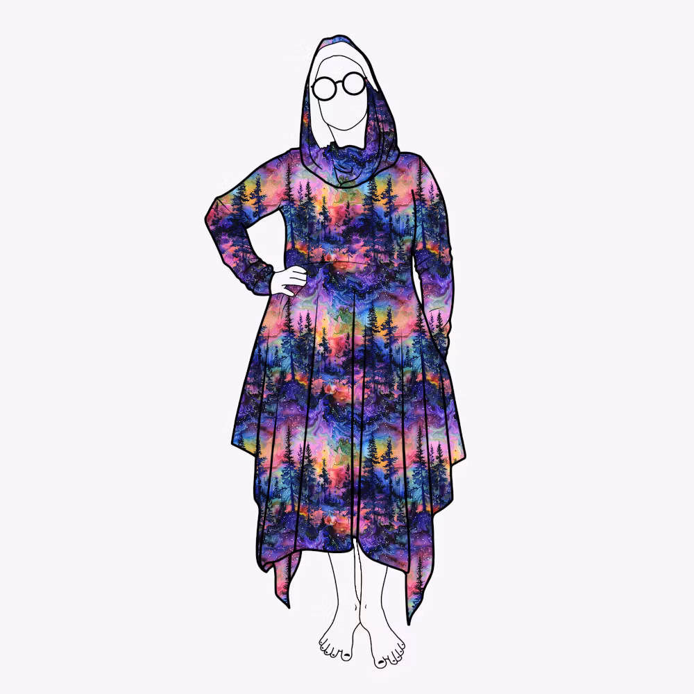 *På bilden på Amanda med klänningen med norrskensmönster så har hon Cozy-huva, långa ärmar med tumhål, A-linje kjol & fickor. Strl 36/48