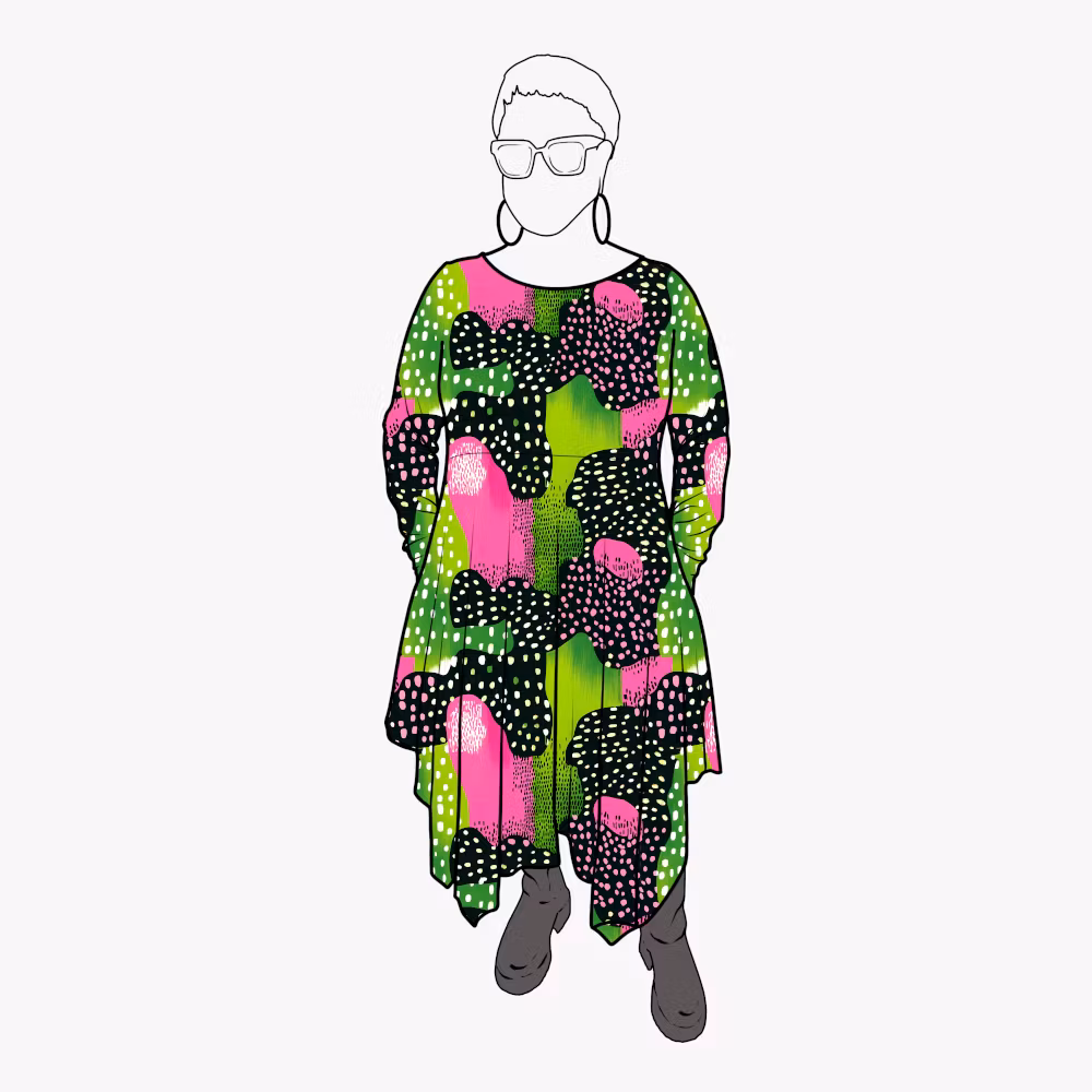 *På bilden på Amanda med klänningen med norrskensmönster så har hon Cozy-huva, långa ärmar med tumhål, A-linje kjol & fickor. Strl 36/48