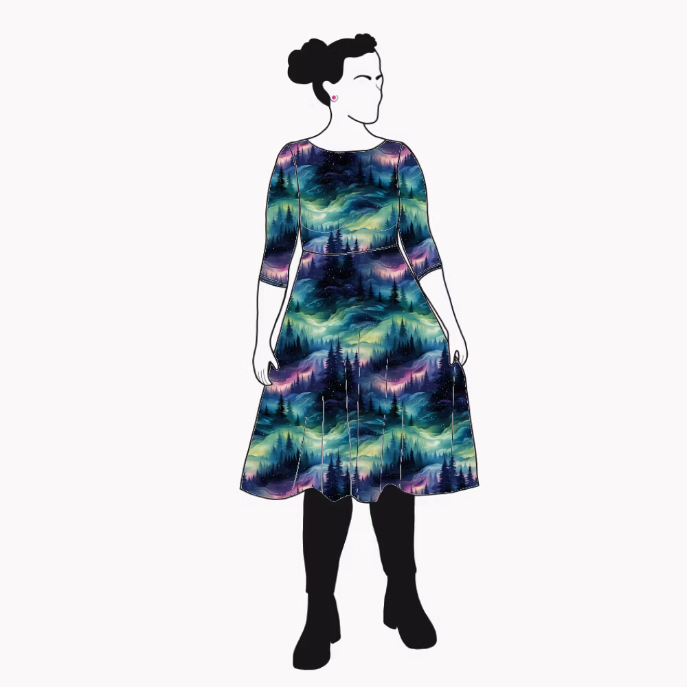 Snurrklänning med 3/4-ärm & vid kjol. Välj mellan rund halsringning eller båtringning!