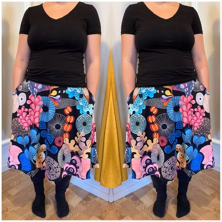 Skön kjol med hög midja med dubbelt lager tyg runt magen. Självklart med fickor om man önskar det!