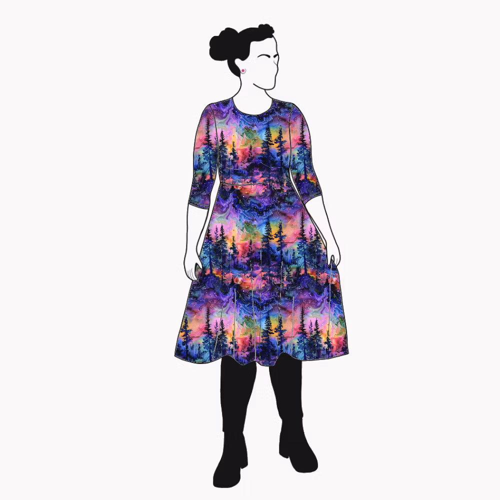 Snurrklänning med 3/4-ärm & vid kjol. Välj mellan rund halsringning eller båtringning!
