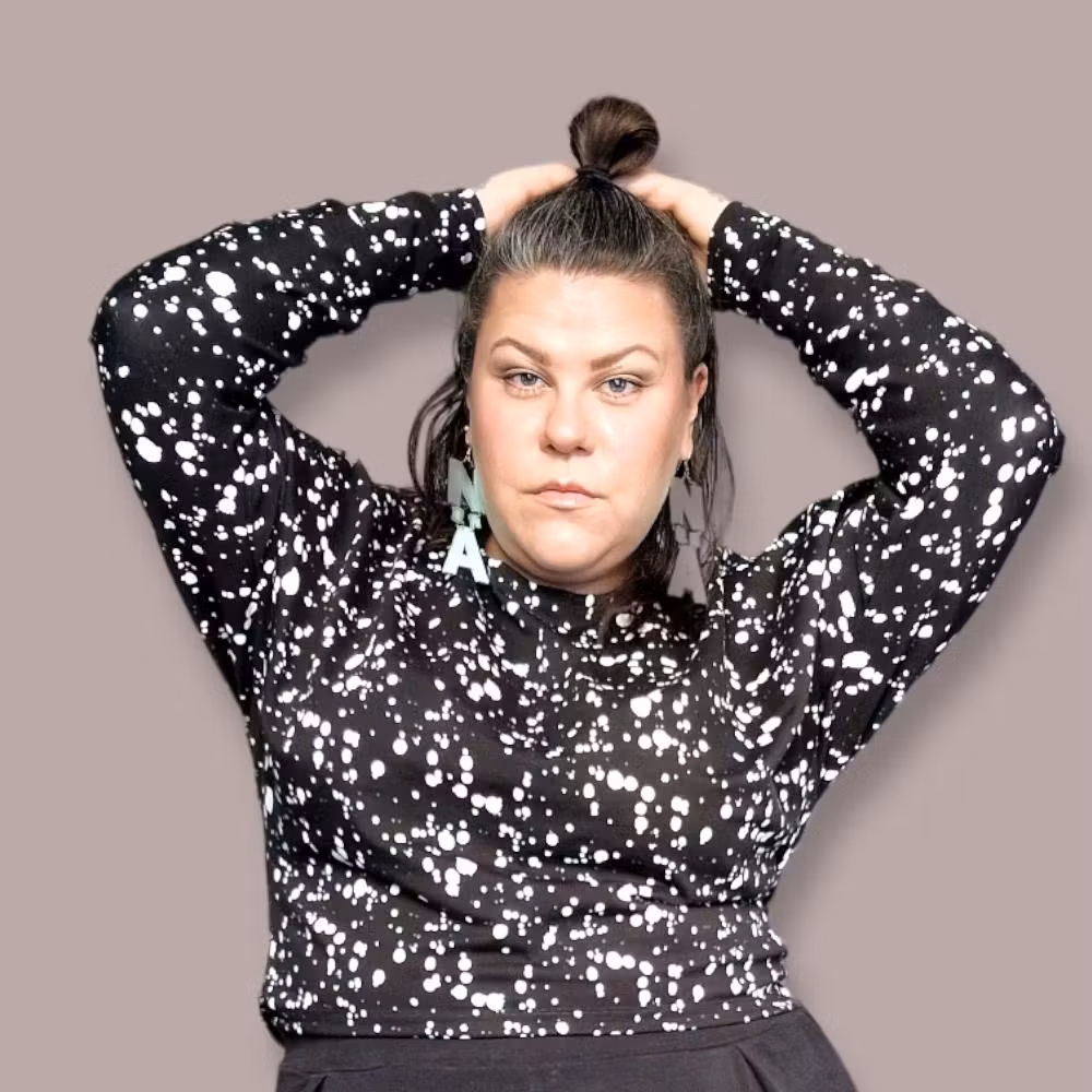 En kort tröja som är lite längre baktill. Smalnar av lite nertill, med breda ärmar som har muddar av samma tyg i ärmslutet.