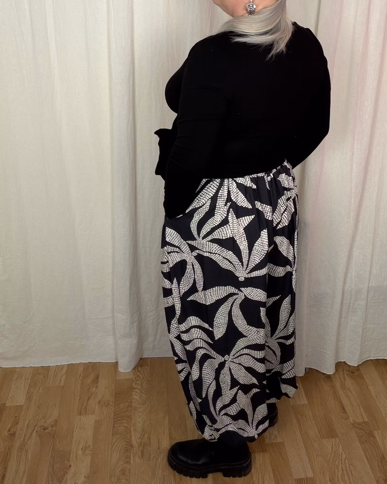 Bubble pants - Valfritt tyg 1 799 SEK I lager Lägg i varukorgen Dela Produktbeskrivning/Storlekstabell Vida byxor i viskosFickor i sidorna, resår i midjan och benslut